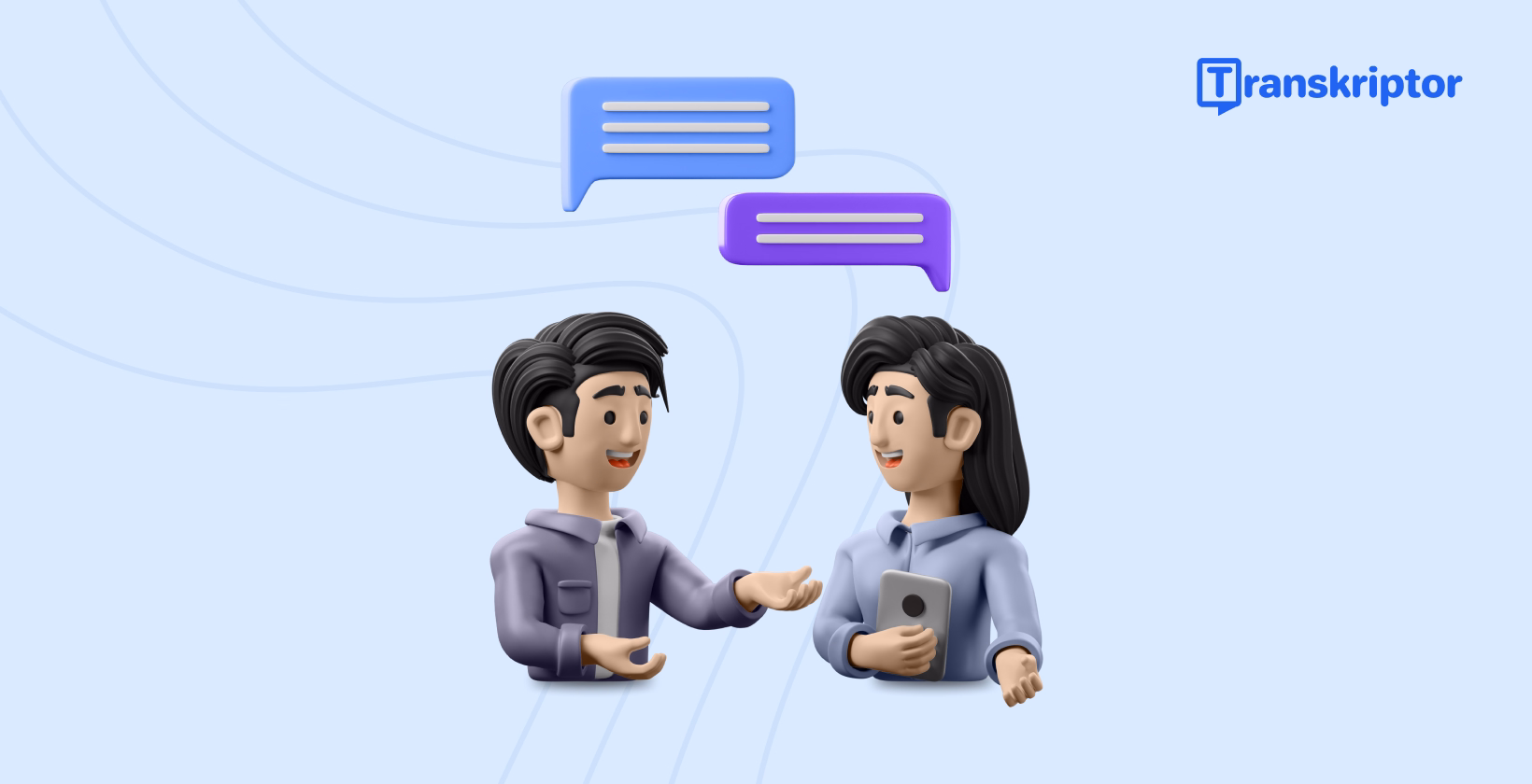 3D-ілюстрація двох професіоналів, які ведуть бесіду з хмарками тексту, що символізують транскрипцію, на світло-блакитному фоні з логотипом Transkriptor.